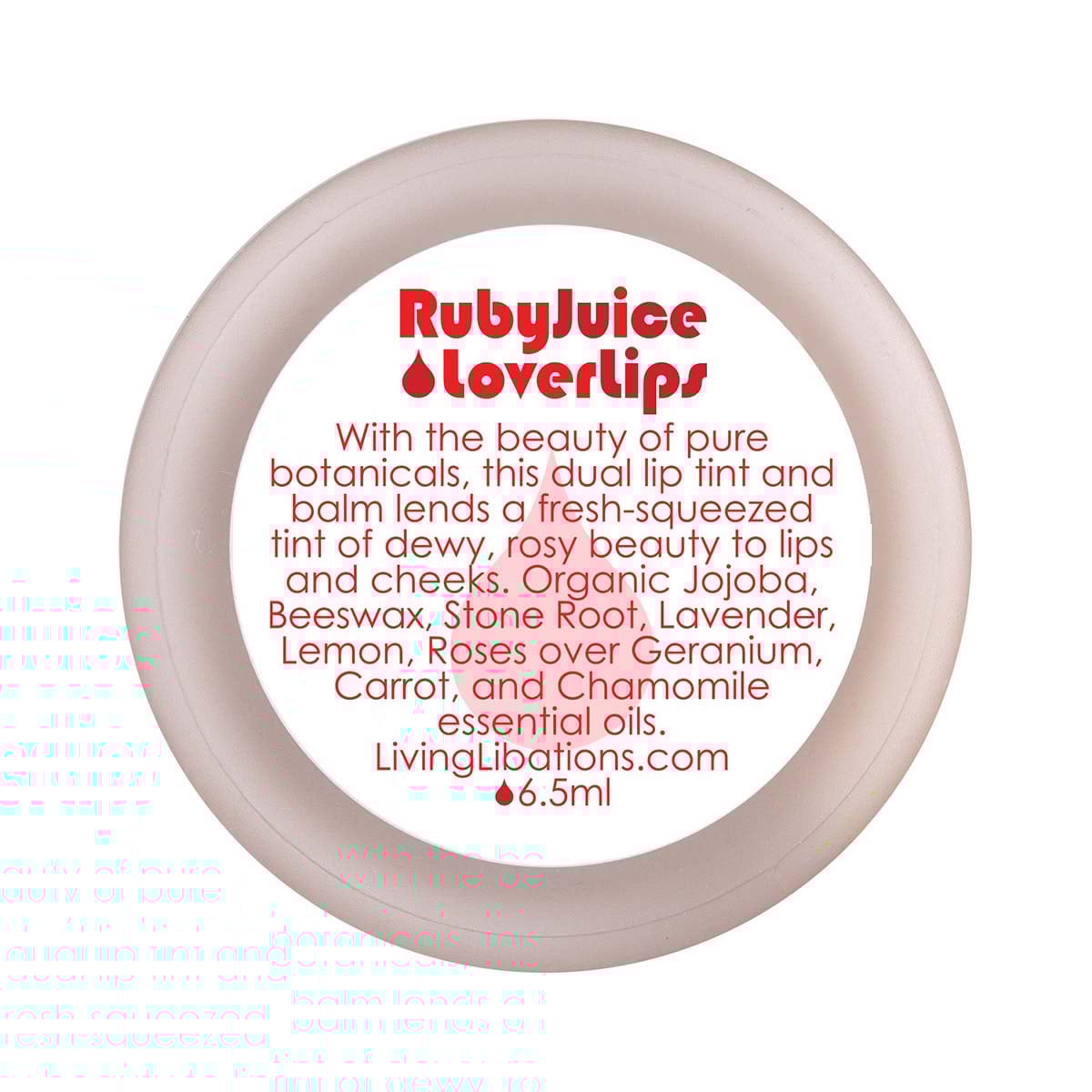 Living Libations Ruby Juice Lover Lips kiss lips and cherub cheeks with the rosy hue of ruby morning dew. A subtle lip stain that doubles as a cheek tint, just a hint of Ruby Juice will blush your face with the glow of natural grace.