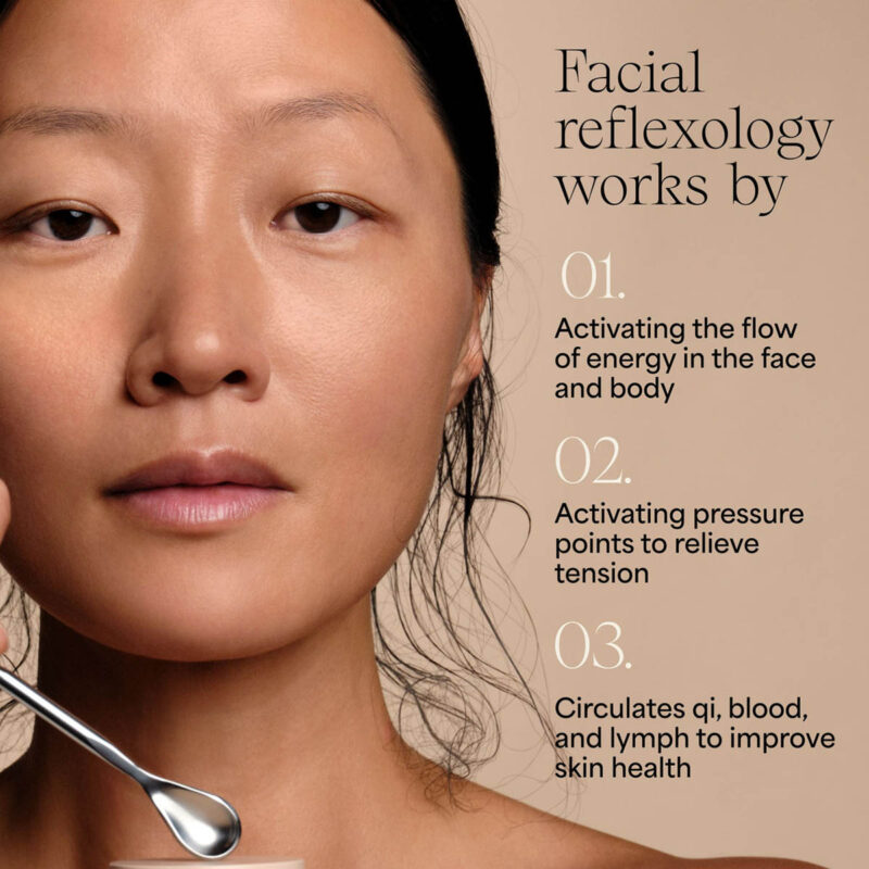 Scoop skincare of choice with the spoon end. Activate points on the face with the reflexology tip.